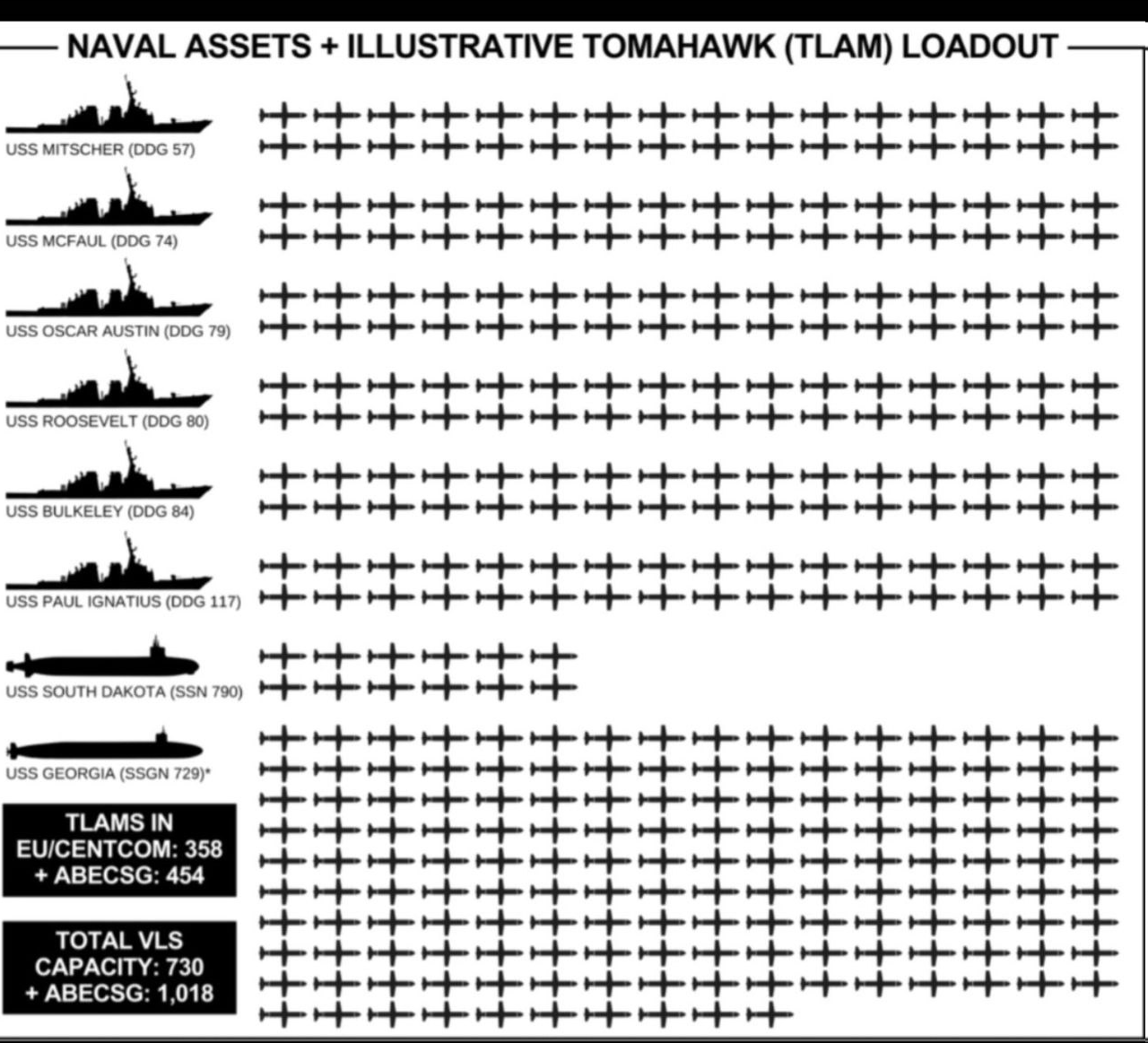 با اعزام و استقرار رزمی ناوگروه آبراهام لینکلن و با احتساب ناوشکن هایی که از قبل در منطقه بودند استعداد رزمی نیروی دریایی آمریکا در اقیانوس هند و دریای عرب (محدوده عملیات فرضی علیه ایران) به شرح زیر است: