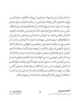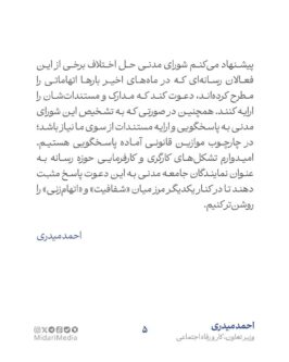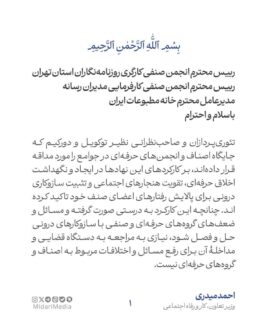 به گزارش پایگاه خبری بازتاب تبریز، احمد میدری در نامهای به رؤسای انجمنهای صنفی روزنامهنگاران استان تهران، مدیران رسانه و مدیرعامل خانه مطبوعات ایران با تأکید بر نقش انجمنهای حرفهای در حفظ اخلاق و هنجارهای صنفی، خواستار تشکیل «شورای مدنی حل اختلاف» شد تا اختلافات و ادعاهای رسانهای از مسیر درونصنفی و نه از طریق دستگاه قضایی حل و فصل شود.