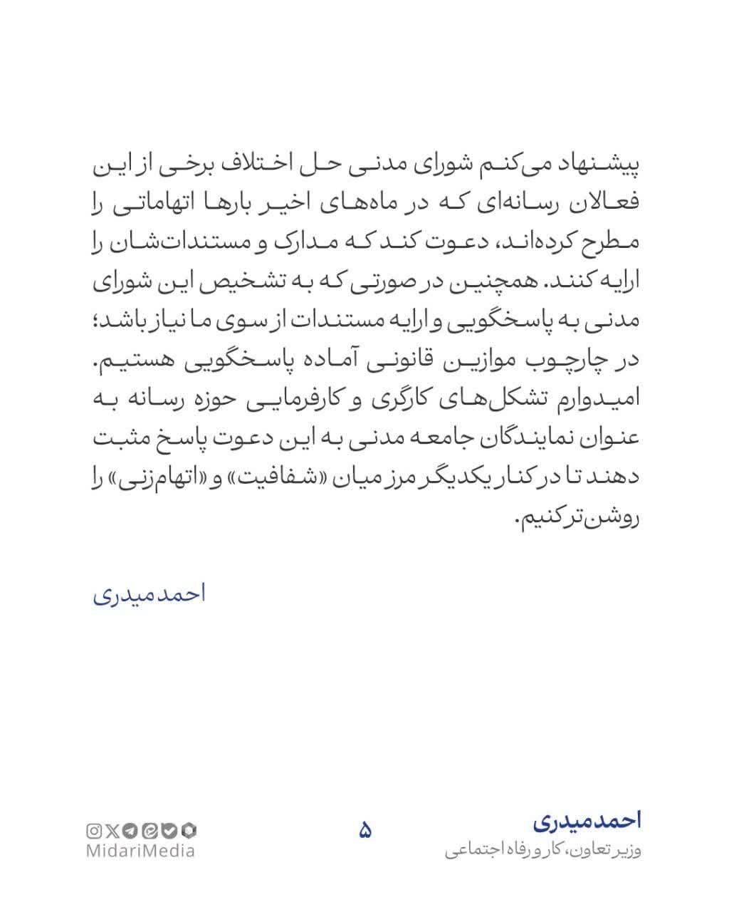 به گزارش پایگاه خبری بازتاب تبریز، احمد میدری در نامهای به رؤسای انجمنهای صنفی روزنامهنگاران استان تهران، مدیران رسانه و مدیرعامل خانه مطبوعات ایران با تأکید بر نقش انجمنهای حرفهای در حفظ اخلاق و هنجارهای صنفی، خواستار تشکیل «شورای مدنی حل اختلاف» شد تا اختلافات و ادعاهای رسانهای از مسیر درونصنفی و نه از طریق دستگاه قضایی حل و فصل شود.